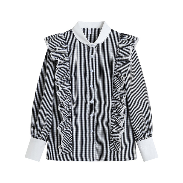 シャープな印象のストライプ柄にたっぷりとボリュームのあるフリルが魅力的な1枚です。