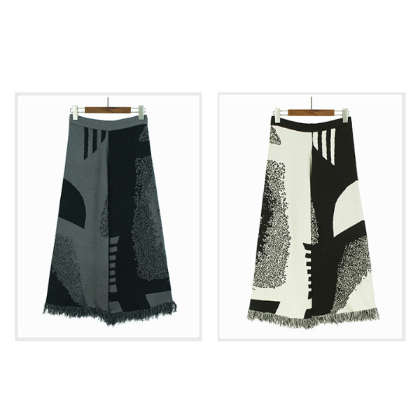 シャープさと遊び心たっぷりなジオメトリック柄が魅力のニットジャガードのワイドパンツ。