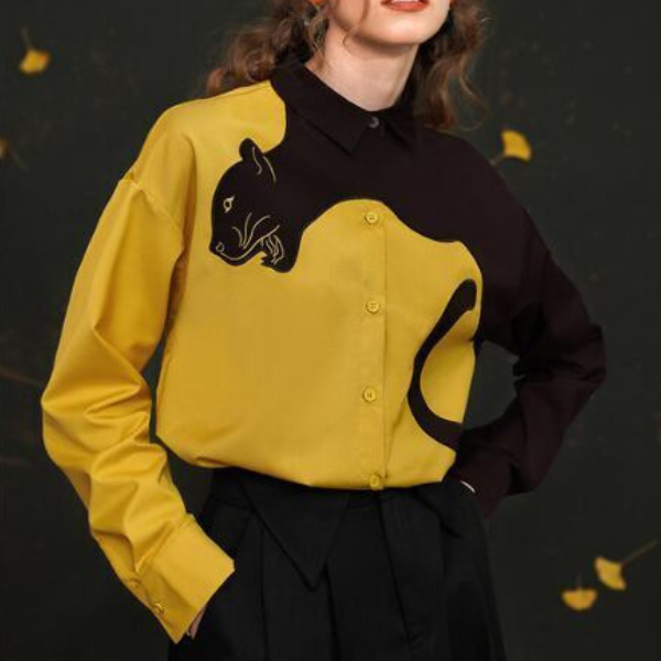 まるでヒョウが肩に乗っているかのようなデザインのブラウス。