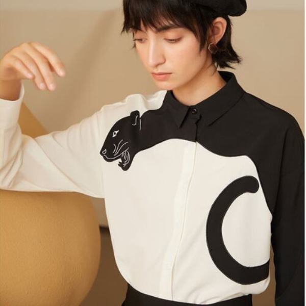 まるでヒョウが肩に乗っているかのようなデザインのブラウス。