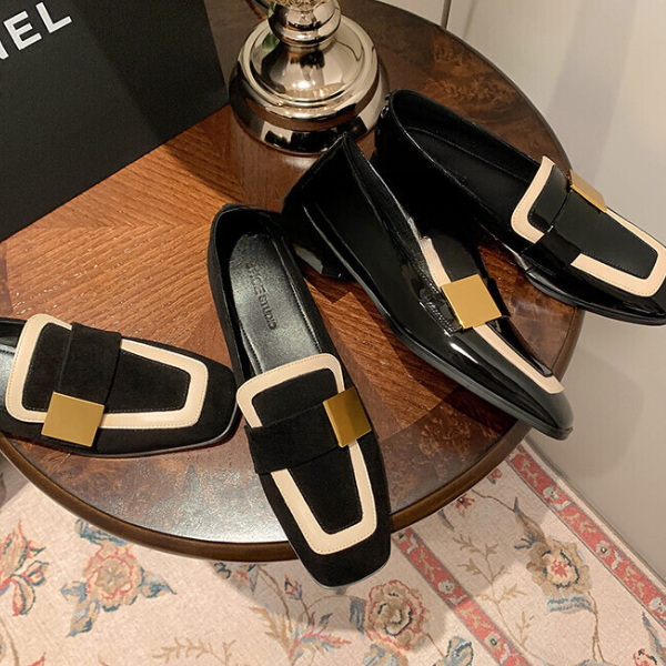 ブラックにアイボリーのラインをデザインした、シンプルながらデザイン性の高いシックなローファー。