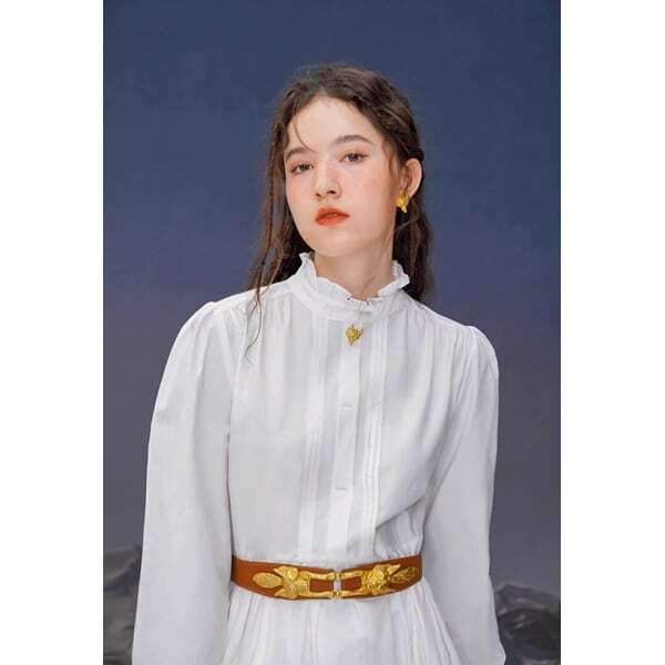 金色の狐のボタンがアクセントを添える華やかさ漂うロングワンピース。