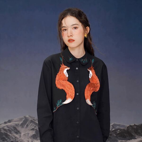 フェイクツーピースフォックス刺繍ブラウス C0105