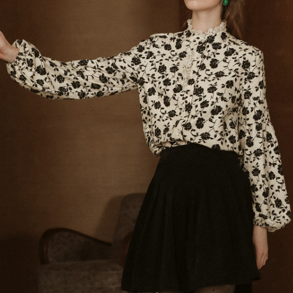 繊細なローズレースが大人の女性らしさを引き立て、レースがあしらわれたスタンドカラーが上品な印象を与えます。
