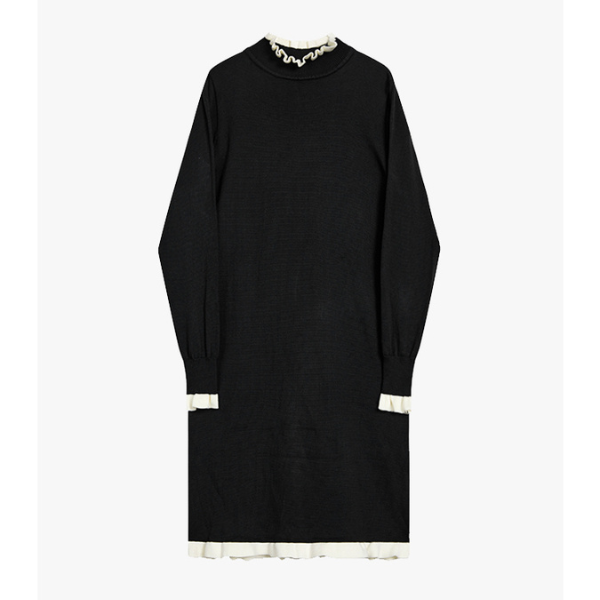 女性らしいシルエットを演出するフリル付きAラインブラックワンピースです。
