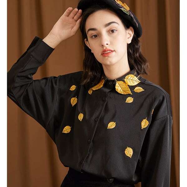 秋深まり、木々からひらひらと舞い降りる美しい落ち葉のような刺繍ブラウス。