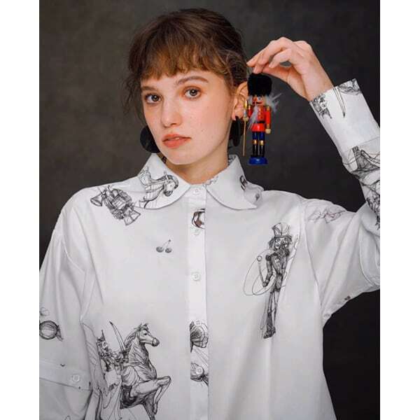 くるみ割り人形イメージ柄のシリーズのシャツブラウス。柄はもちろんのこと、襟先デザインや袖の着脱可能なボタンデザインまで抜かりなくおしゃれ!!バックのタックと裾のラウンドヘムデザインが立体感のあるシルエットを演出してくれます。