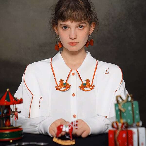 【2color】木馬刺繍配色ビッグ衿ブラウス C0109