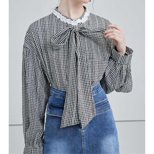 可愛らしいフロントリボンがアクセントのギンガムチェックルーズブラウス。