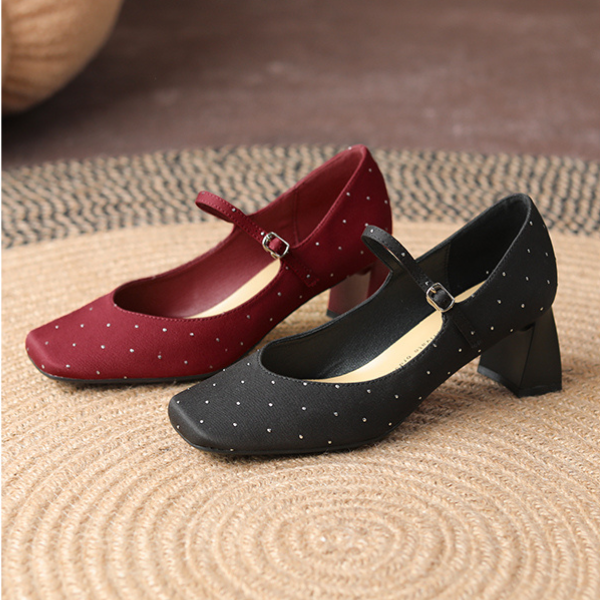 モダンな印象を与えるスクエアトゥチャンキーヒールドットパンプス。