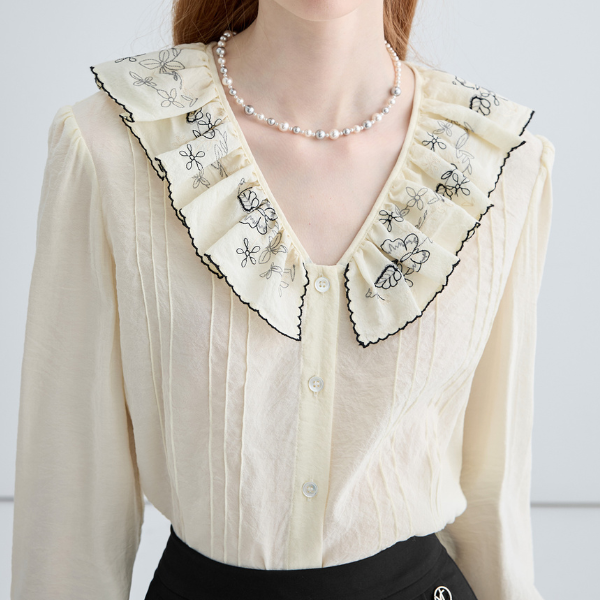 女性らしい艶めきを纏ったドールカラーフレンチレースブラウス。