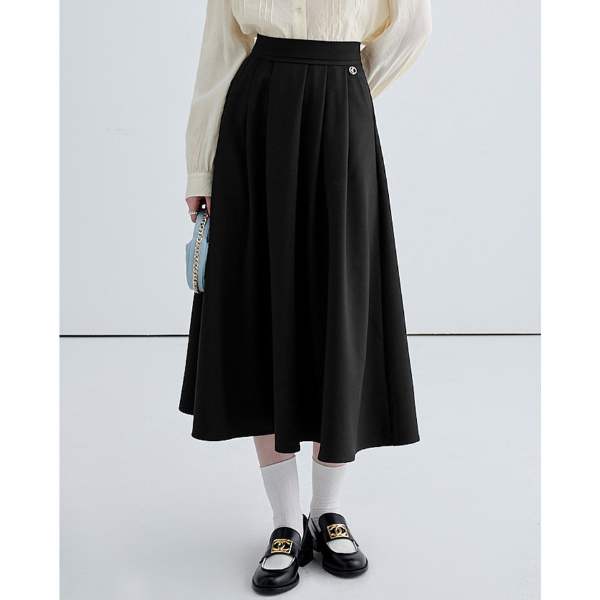 華やかさと品のあるスタイルを演出するハイウエストドレープAラインプリーツスカート。