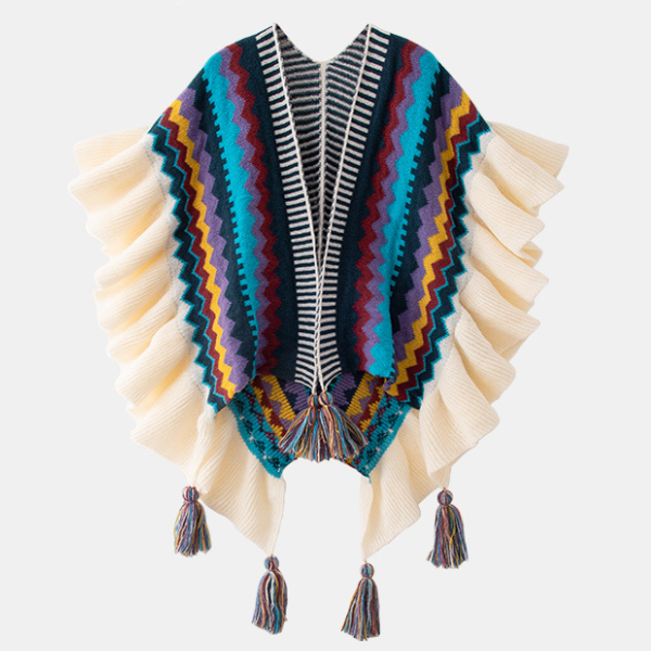 まだ見ぬ大地を旅するような気分になれるタッセル付きエスニックスタイルケープマント。