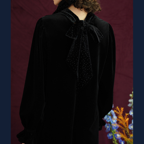 ボディラインを綺麗に見せてくれる程よいフィット感と、上品な雰囲気を盛り上げるリボンがポイント。