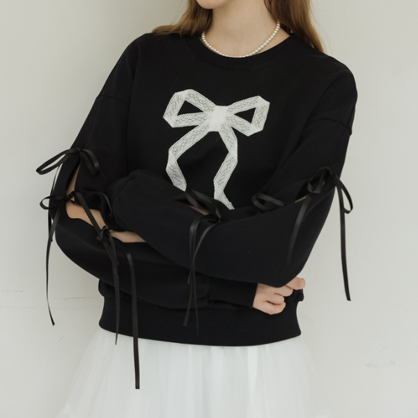 ブラックカラーに施されたリボンプリントがインパクトを与えるスウェットシャツ。
