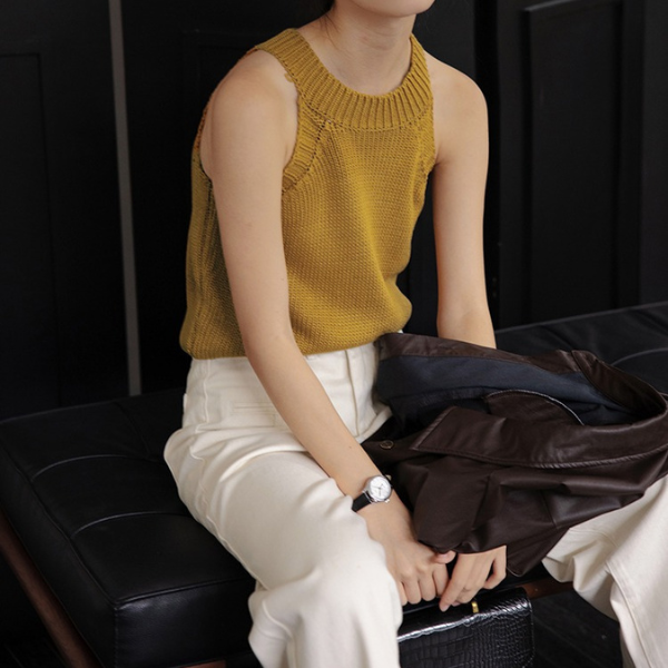 ホルターネックが上品な印象を与え、女性らしいシルエットを演出するノースリーブトップス。