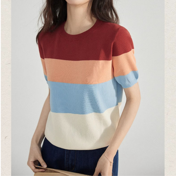 ポップで楽しい雰囲気を演出するカラフルなボーダー柄が印象的なニットトップス。