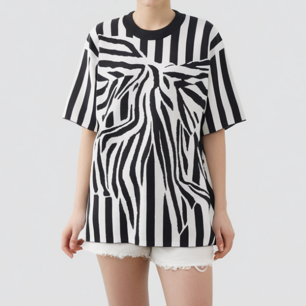 独創的なストライプ×ゼブラ柄が目を引く、プリントニットトップ。