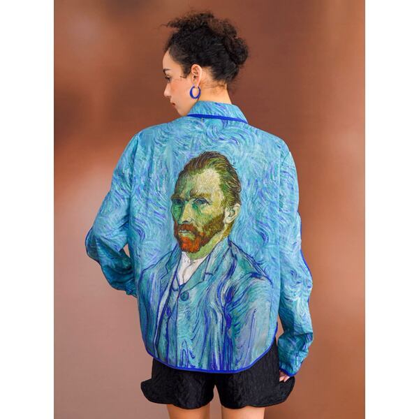 ルネサンス時代を彷彿させる、大胆なゴッホの自画像プリントは注目度UP間違いなし!油絵タッチの繊細なプリント手法もこだわりを感じられるポイントです。ブルーの配色パイピングと背景柄とのコンビネーションや袖のスリットデザインもオシャレ度を上げてくれます。