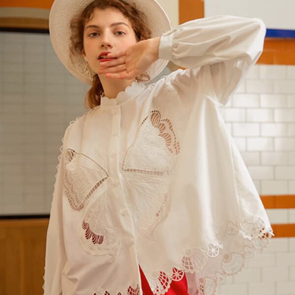 フロントに施された大胆な蝶々モチーフ刺繍がとてもキュートなブラウス。繊細な刺繍と透かし部分のデザインが相まってぐっとオシャレでこだわりを感じる印象に◎襟元、袖レース、裾はスカラップになっており、大人可愛くキマる1枚です。