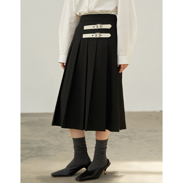 【2color】二つのベルト付きミモレ丈Aラインプリーツスカート Z00223