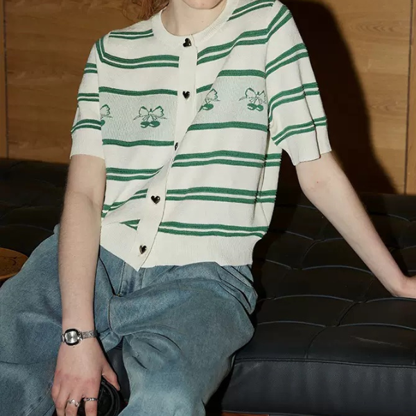 ハートのボタンやさくらんぼの模様が、遊び心を感じさせ、着るだけで気分が上がります。