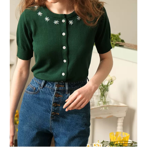 お花の刺繍入りラウンドネック半袖ニット Z00233
