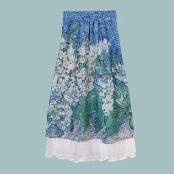 風情漂うレースと油絵風プリントが施された、寒色系のロングスカート。
