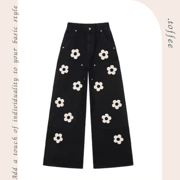 可愛らしいフラワーアップリケが施されたブラックワイドデニムパンツ。
