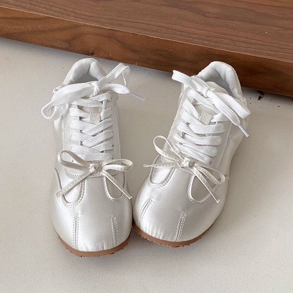 おしゃれな足元を演出するラウンドトゥリボン付きレースアップスニーカー。