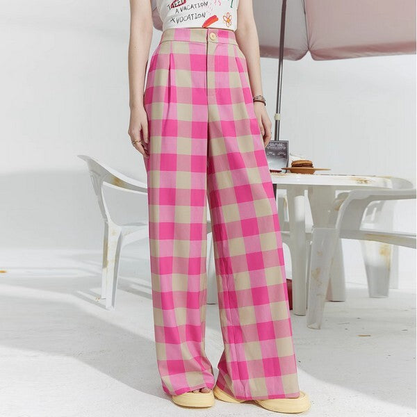 ビビッドなピンクカラーが目を引くブロックチェックワイドパンツ。