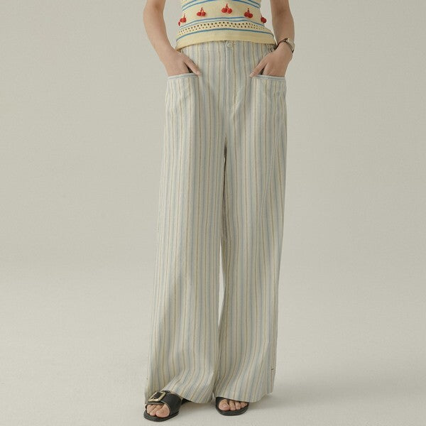 清涼感漂うライトブルーカラーのストレートパンツ。