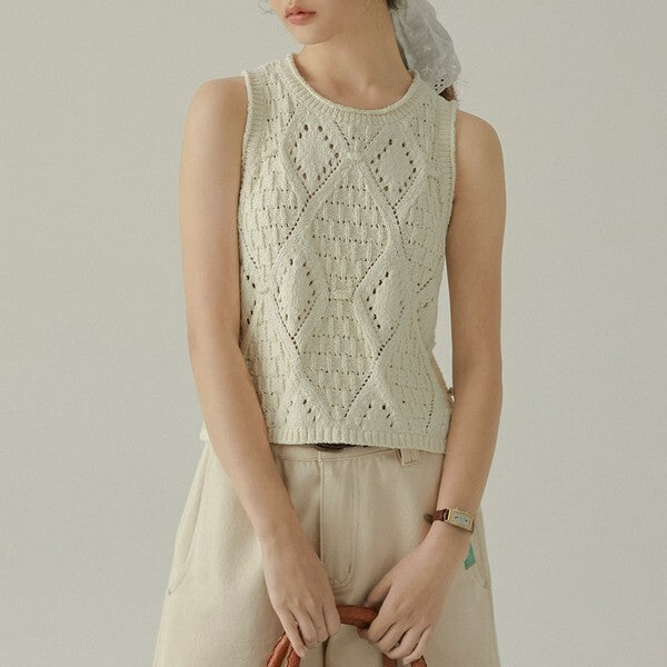 エスニックな雰囲気漂うノースリーブニットトップ。
