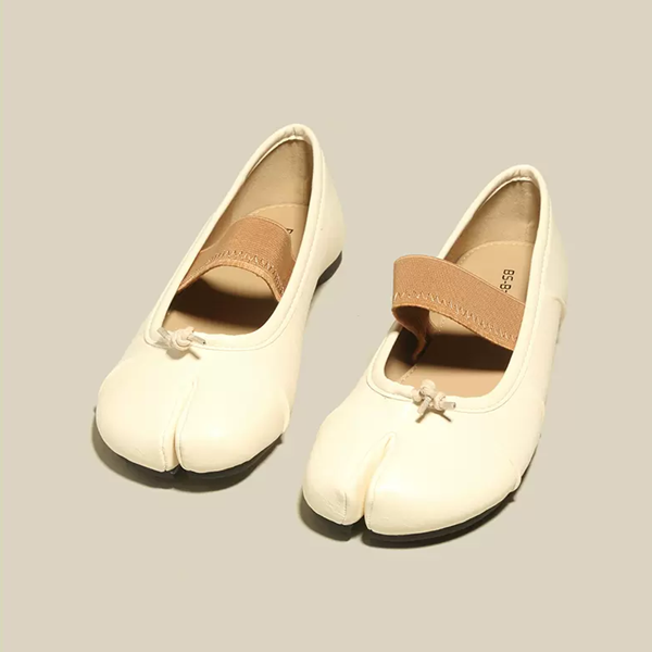 ユニークな足袋風デザインが特徴のおしゃれなフラットシューズ。ベーシックなオフホワイトとブラックの2色を展開しており、ボトムス次第でカジュアルにもエレガントにも履きこなせます。足元を華やかに演出してくれる一足で、普段のコーディネートにアクセントを加えてくれる一足。