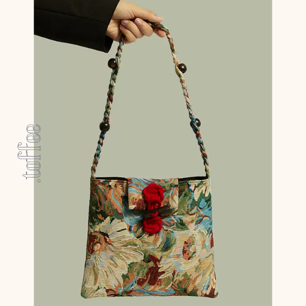 大胆な花々が描かれたレトロな油絵ショルダーバッグ。ストラップ部分が三つ編みになっており、さりげないアクセントがおしゃれ度をアップさせます。存在感のあるアートなデザインは、周りと差をつけたい方におすすめです。
