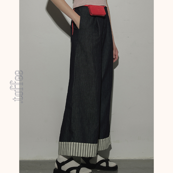 ハイウエストで美しいシルエットを演出するデニムパンツ。足元からこなれ感をプラスするストライプ柄がポイント。ワイドなシルエットでリラックス感も抜群です。デニム素材なので、カジュアルながらも大人っぽさも演出できます。