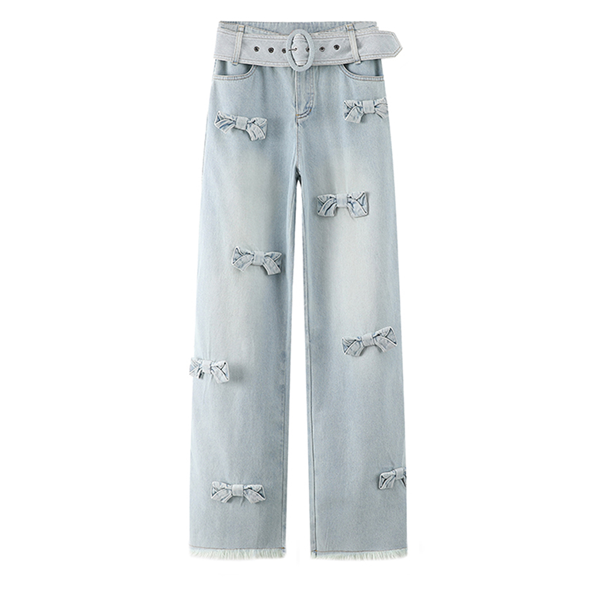 カジュアルなコーディネートに取り入れるだけで、一気におしゃれなスタイリングが完成するリボン付きワイドデニムパンツ。ライトブルーのデニム生地にたくさんのリボンが配されており、遊び心満載のデザインが魅力です。ワイドシルエットで足元を華やかに演出し、一気におしゃれ度をアップさせます。毎日のコーディネートがもっと楽しくなりそう。