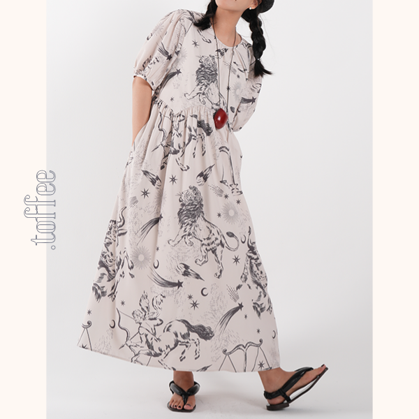 星空をイメージしたゴージャスなプリント柄が、個性的な魅力を放つルーズワンピース。シルエットはAラインで、ゆったりとしたロング丈が女性らしい品のある雰囲気を演出します。星座好きな方にぴったりのおしゃれな一枚♡