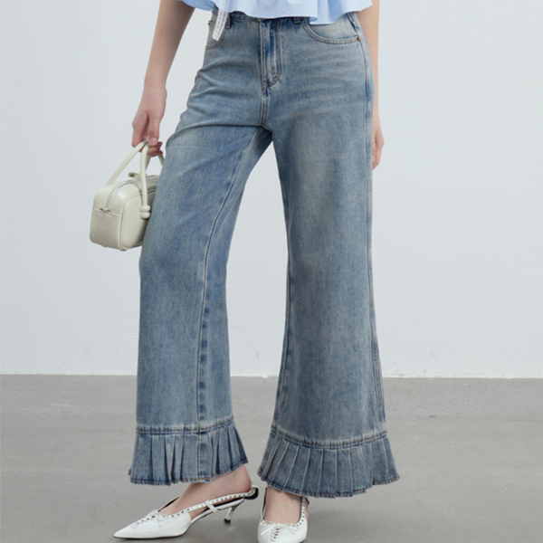 オシャレな女性たちに大人気のプリーツヘムデニムフレアパンツ。洗練されたブルーのデニム生地が、シンプルながらもエレガントな印象を与えます。足元に向かって広がるフレアシルエットとプリーツヘムが最大のポイント。自信を持って輝くあなたを応援する一本です。