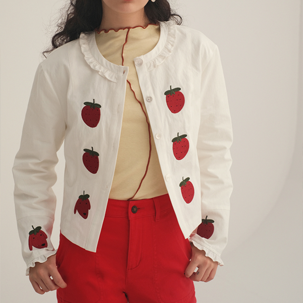 可愛らしいストロベリープリントがインパクトを与えるガーリーなホワイトブラウス。可愛らしいフリルの襟がアクセントになり、身に着けているだけでHAPPYな気分に♡肌なじみの良いコットンとリネン素材で作られており、快適な着心地を叶える一枚です。