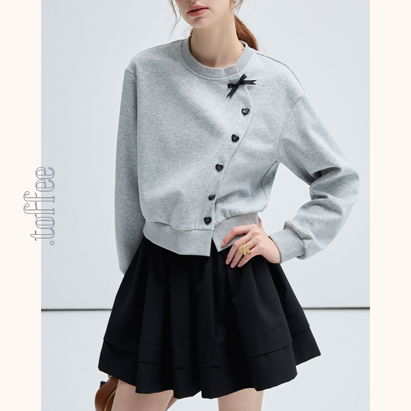 個性溢れるリボン&ハートボタンがアクセントになった、可愛らしいショート丈カーディガン。首元に小さなブラックリボンが付いており、女性らしさを引き立てます。着るだけで気分も華やぎ、周りの視線を集めること間違いなしの一枚です。