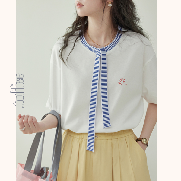 ドロップショルダーデザインにブルーストライプと可愛い赤い貝殻の刺繍が施された大人可愛い一枚。ルーズなシルエットで着心地も抜群で、お洒落感を演出してくれます。アクセントのタイ付きで、トップスだけでも十分におしゃれに着こなせます。