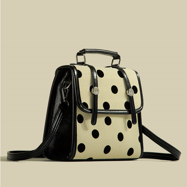 2way仕様で使いやすさ抜群のスモールバッグ。ストラップは取り外しが可能ですので、リュックとしてもハンドバッグとしてもお使いいただけます。ポルカドット柄が可愛らしさを演出し、コーディネートのアクセントにも最適。
