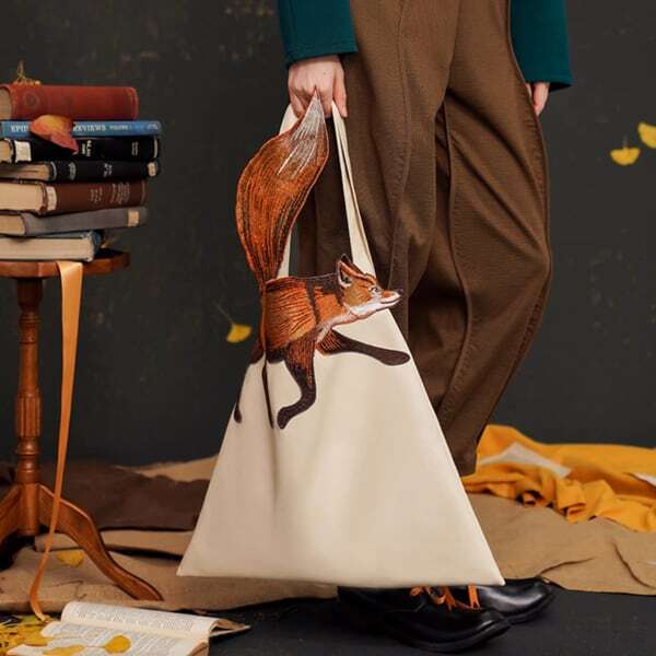 ハンドル部分に見え隠れするキツネの刺繍がユーモアたっぷりのトライアングルトートバッグ。