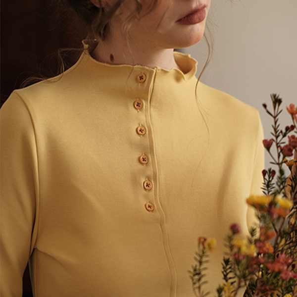 気持ちが明るくなるイエローカラーのボトミングトップ。襟と袖、裾に施されたクシュクシュのひだのディテールが可愛らしくてアクセントに。ノースリーブのワンピースやベストとコーディネートしたくなるオシャレな一枚。