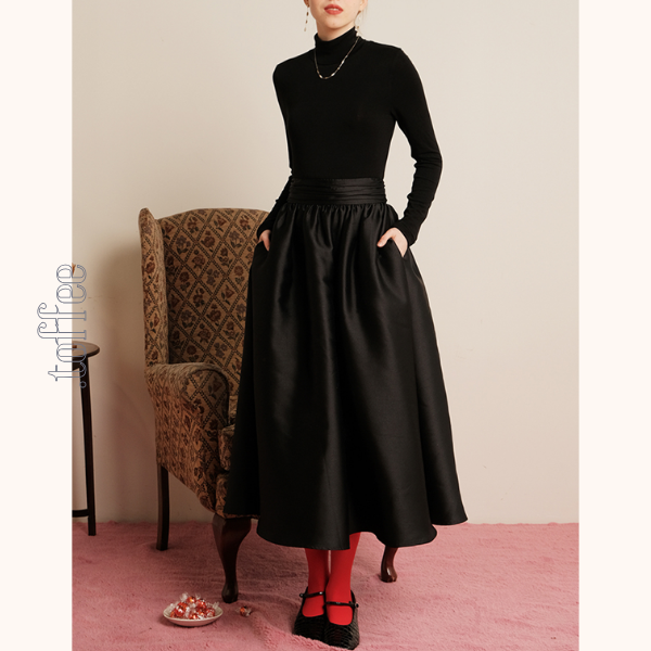 一見、スリムなハイネックトップとロングスカートのセットアップのように感じられる、レイヤード風ロングワンピース。上半身は細身のラインを演出できるスリムなデザインで、スカートのはきれいに広がったエレガントなAライン。鮮やかなカラーの小物使いでオシャレを楽しんでみて♡