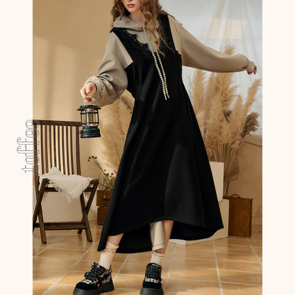 重ね着風のデザインが特徴的な、センス際立つロングワンピース。 ブラックとグレーのバイカラーが魅力でカジュアルな雰囲気を放つフードも備わっています。 優雅なレースのディテールが施され、胸元に女の子らしい可愛らしさを添えています。さらに、まるでおさげのようなドローストリングが一味違った愛らしさを演出。細部までこだわり抜いた特別なアイテムです。