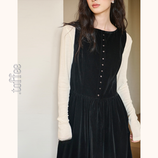 シンプルながらも洗練された印象を与える、ブラックAラインロングワンピース。フロントに並んだ小さなボタンが、さりげないアクセントとなり、女性らしさを際立たせます。Aラインのシルエットは、スタイルを美しく見せてくれるだけでなく、動くたびに柔らかな印象を与えます。あなたのワードローブに新たな魅力を加えてみて♡