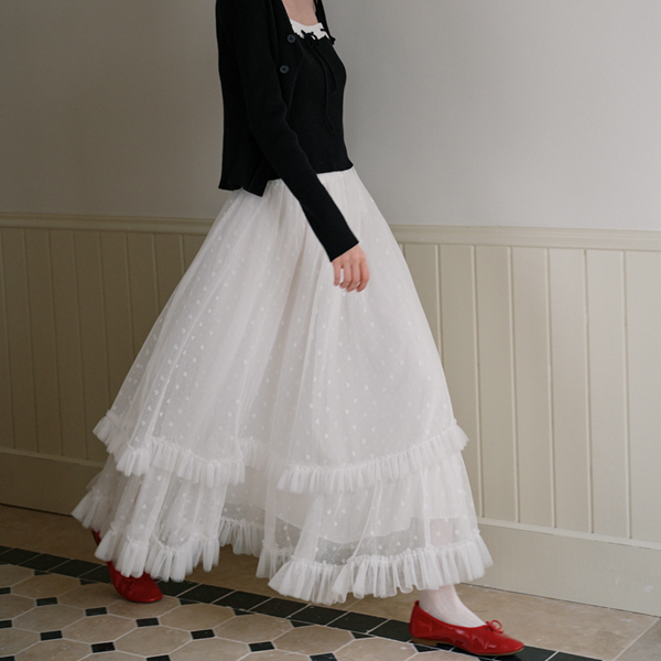 華やかさと柔らかさを兼ね備えた、フリル&メッシュホワイトロングスカート。軽やかなメッシュ素材と愛らしいフリルのデザインが特徴で、気軽にリラックスしたスタイルを楽しめます。シンプルなトップスと合わせるだけで、鮮やかな印象を与えつつ、さまざまなシーンで華やかに映える一着です♡日常使いはもちろん、特別な日のコーディネートにもマッチするアイテム。