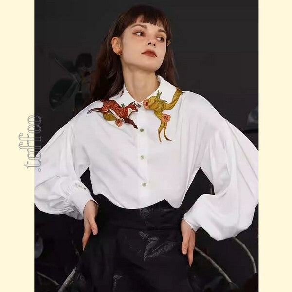 「小狐物語」 オリエンタルテイストが香る:キツネ刺繍ドリーミーブラウス C0183